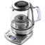 Чайник устанавливается на базу с поворотом на 360 градусов: здесь же, на базе, находится электронная панель управления с цифровым дисплеем и кнопками. При помощи кнопок можно выбрать режимы кипячения воды или заваривания чая, тип чая, крепость заваривания, а также активировать дополнительные функции.