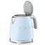 Чайник Smeg KLF05PBEU изготовлен ведущей итальянской фирмой, он относится к известной коллекции в стиле 50-х годов 20 века. Компактная модель высотой 20 см и весом 1 кг может подойти для семей из 2-3 человек, а также для поездок на дачу или использования в офисе. Привлекает внимание корпус необычного пастельно-голубого цвета с блестящими деталями — удобной хромированной ручкой, полированным стальным носиком, оригинальным рычагом включения. Сам корпус изготовлен из специального пластика, безопасного и термостойкого, а его внутренняя часть сделана из нержавеющей стали.