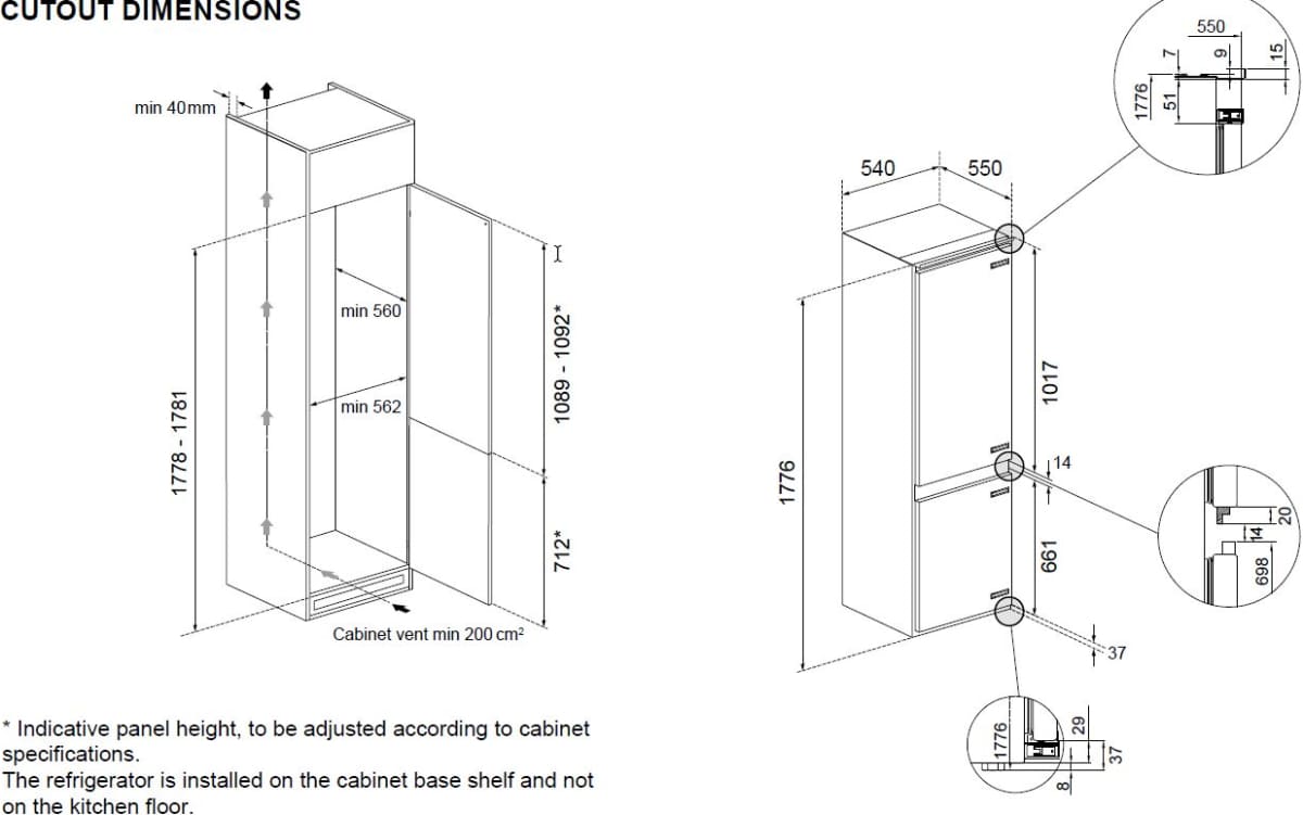 Габариты корпуса — 177,6 × 54 × 55 см — позволяют легко вписать устройство в стандартную нишу высотой от 177,8 до 178,1 см, шириной 56,2 см и глубиной 56 см. Такая точность монтажных параметров гарантирует плотное прилегание, вентиляцию и беспрепятственное открывание дверей. Благодаря полностью встраиваемому исполнению, техника скрывается за фасадами кухонного гарнитура, сохраняя целостность дизайна и подчёркивая лаконичность пространства.