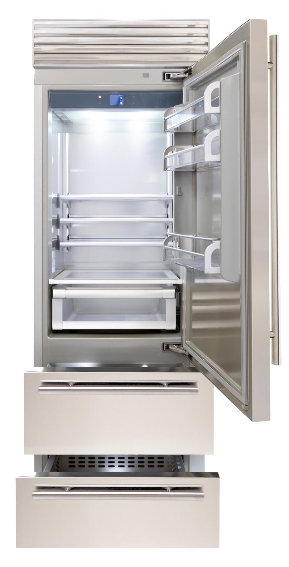 Наиболее разнообразны по ширине большие модели холодильников с распашными дверями типа Side-by-Side или модели с так называемыми французскими дверями. Ширина этих устройств может варьироваться в диапазоне от 80 до 160 см: многие из них представляют собой полноценный холодильник и морозильную камеру, расположенные рядом друг с другом. Несколько реже встречаются отдельностоящие холодильники нестандартной ширины от 70 до 90 см с верхней или нижней морозильной камерой — в основном это так называемые азиатские модели с морозильником сверху.