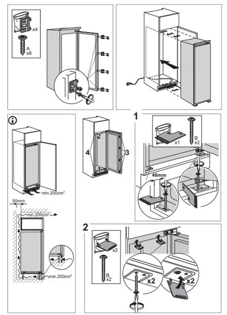 Во встраиваемых моделях имеется специально организованная система вентиляции, не позволяющая им перегреваться при установке в шкаф-пенал или нишу. Нередко в них имеется вентиляционная база с решеткой в цоколе: она выдерживает достаточные нагрузки и позволяет обеспечить необходимый уровень вентиляции. Системы внутренней вентиляции призваны равномерно распределять охлажденный воздух по всему объему камеры и поддерживать естественную влажность. Для моделей с системой размораживания No Frost предусмотрена принудительная вентиляция, которая предусматривает движение воздуха через испаритель.