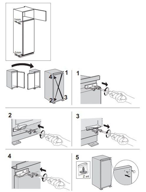 Прибор в этом случае помещается в колонну, шкаф или нишу, а на корпус этого шкафа или колонны крепится отдельная дверца на собственных петлях. Затем это дверца и дверь холодильника соединяются между собой при помощи специальных скользящих полозьев, или слайдеров. При открывания наружной дверцы внутренняя скользит вдоль нее на этих направляющих, так что происходит смещение их друг относительно друга. Дверца при этом открывается на угол не более 90 градусов.