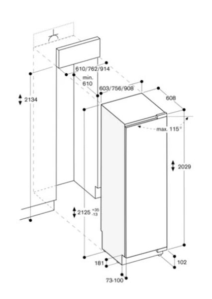 Встраиваемые холодильники монтируются в нишу или колонну. Передняя их часть закрывается декоративным мебельным фасадом и снаружи не отличается от дверцы обычного кухонного шкафа, так что их не нужно подбирать под интерьер помещения. Объем этих холодильников, как правило, несколько меньше, чем у отдельностоящих, так как при встраивании необходимо оставлять свободное пространство для вентиляции. Они отличаются меньшим уровнем шума, а также лучше держат холод и отличаются большей экономичностью из-за дополнительного слоя изоляции. Ассортимент этих холодильников не так велик, как у отдельно стоящих, установка более трудоемкая, а стоимость обычно несколько выше.