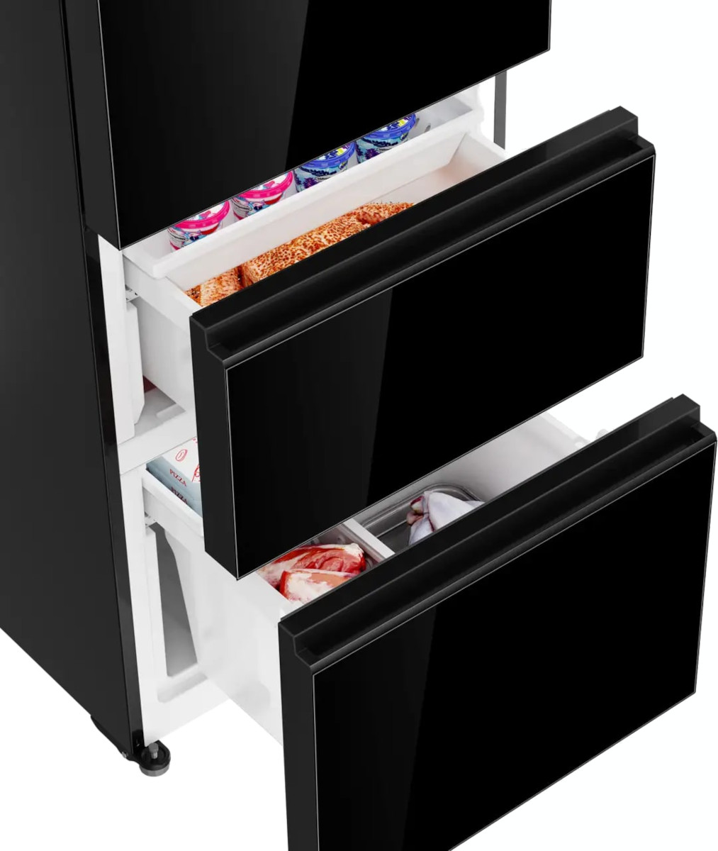Удобство эксплуатации обеспечено продуманной внутренней компоновкой: общий полезный объём 388 л разделён на холодильную секцию 263 л, морозильник 103 л и зону свежести 22 л. Полки из закалённого стекла выдерживают тяжёлые ёмкости и легко очищаются, средняя полка может складываться, чтобы освободить дополнительное пространство. Внизу встроены два больших ящика для овощей и фруктов, один из них с контейнером HumidityZone и системой HCS — мембраной для регулировки оптимальной влажности. Такая конструкция помогает дольше сохранять хрустящую текстуру зелени и сочность фруктов.