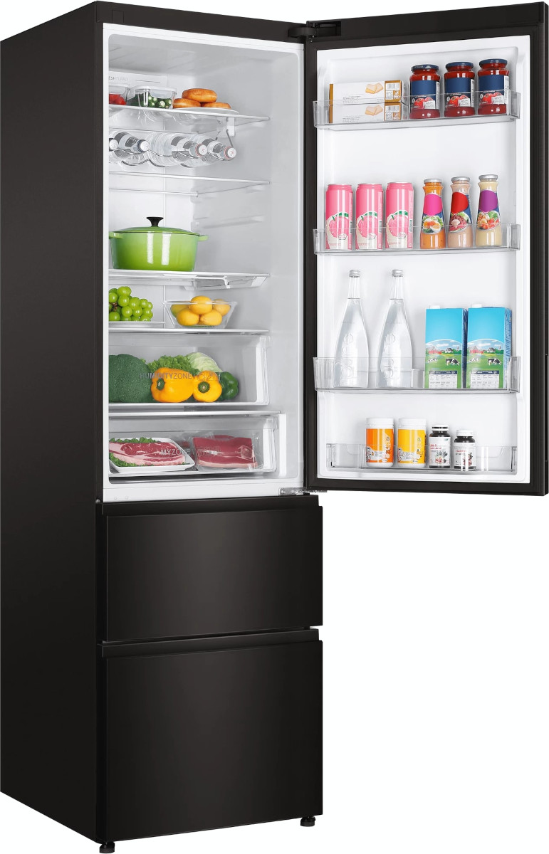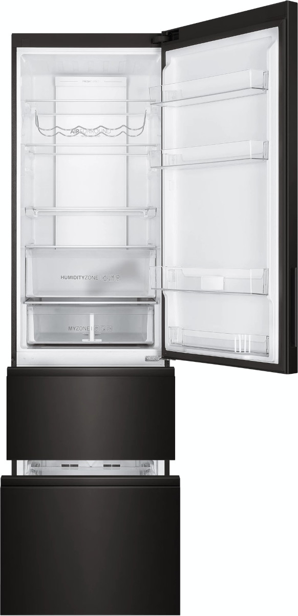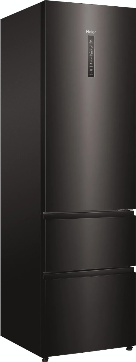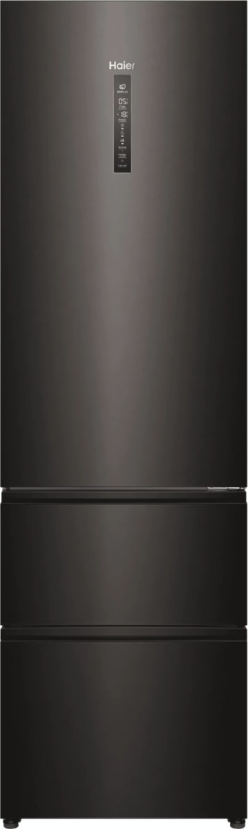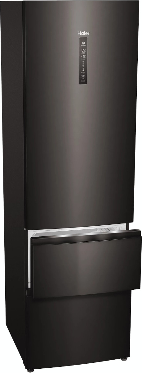 Холодильник Haier A4F739CBXGU1 — стильное решение в цвете «Черная сталь» с металлическим фронтом и скрытой ручкой. Высота 200 см и габариты 20059.568.2 см обеспечивают вместительность при компактной ширине. Три двери и расположение морозильной камеры позволяет удобно организовать хранение запасов: основные продукты под рукой, а доступ к заморозке ниже.