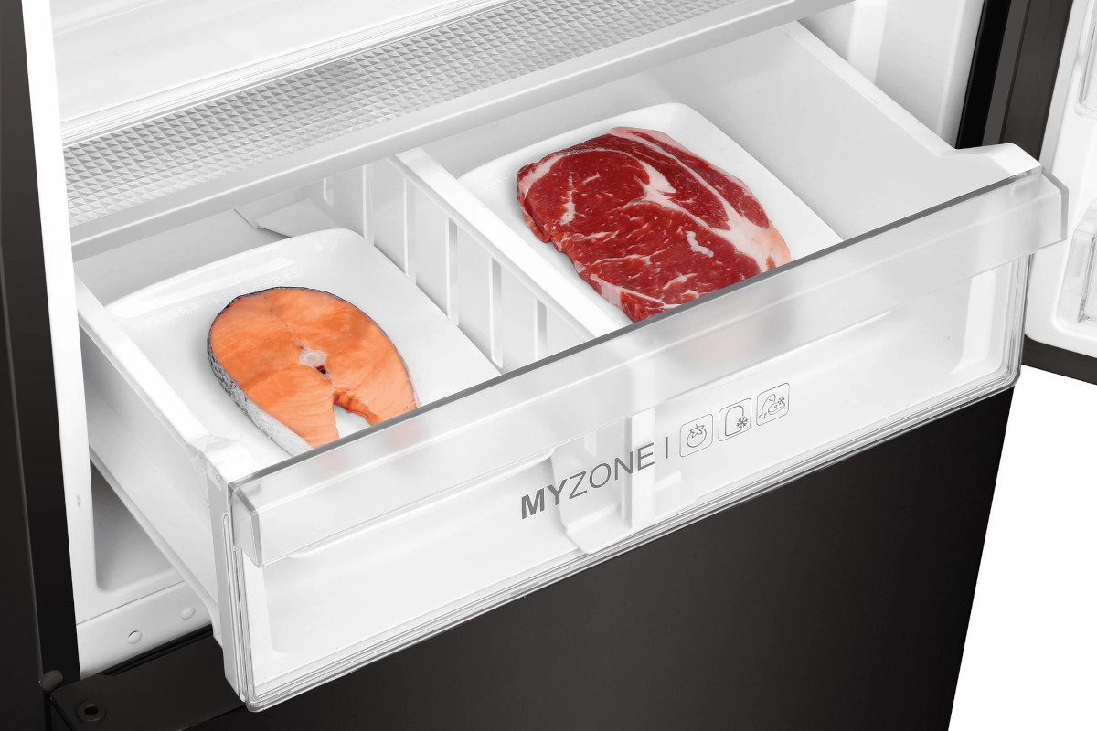 Внутреннее пространство спроектировано для повседневного удобства. Общий полезный объём 389 л распределён на 286 л в холодильной и 103 л в морозильной камере, плюс 22 л зона свежести для мяса и рыбы. Четыре стеклянные полки, складная средняя полка и место в дверце позволяет размещать различные емкости и бутылки. В комплекте два ящика для овощей и фруктов и контейнер HumidityZone с контролем влажности.