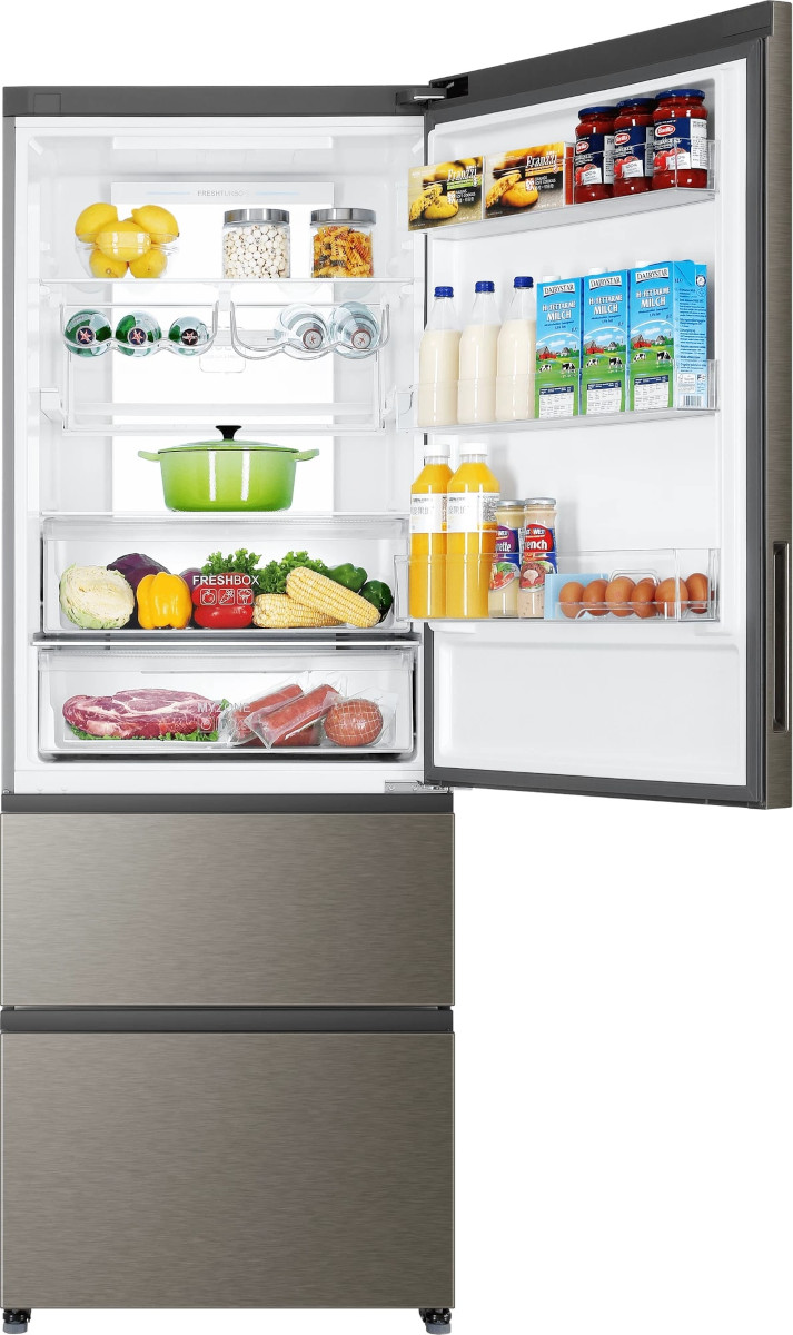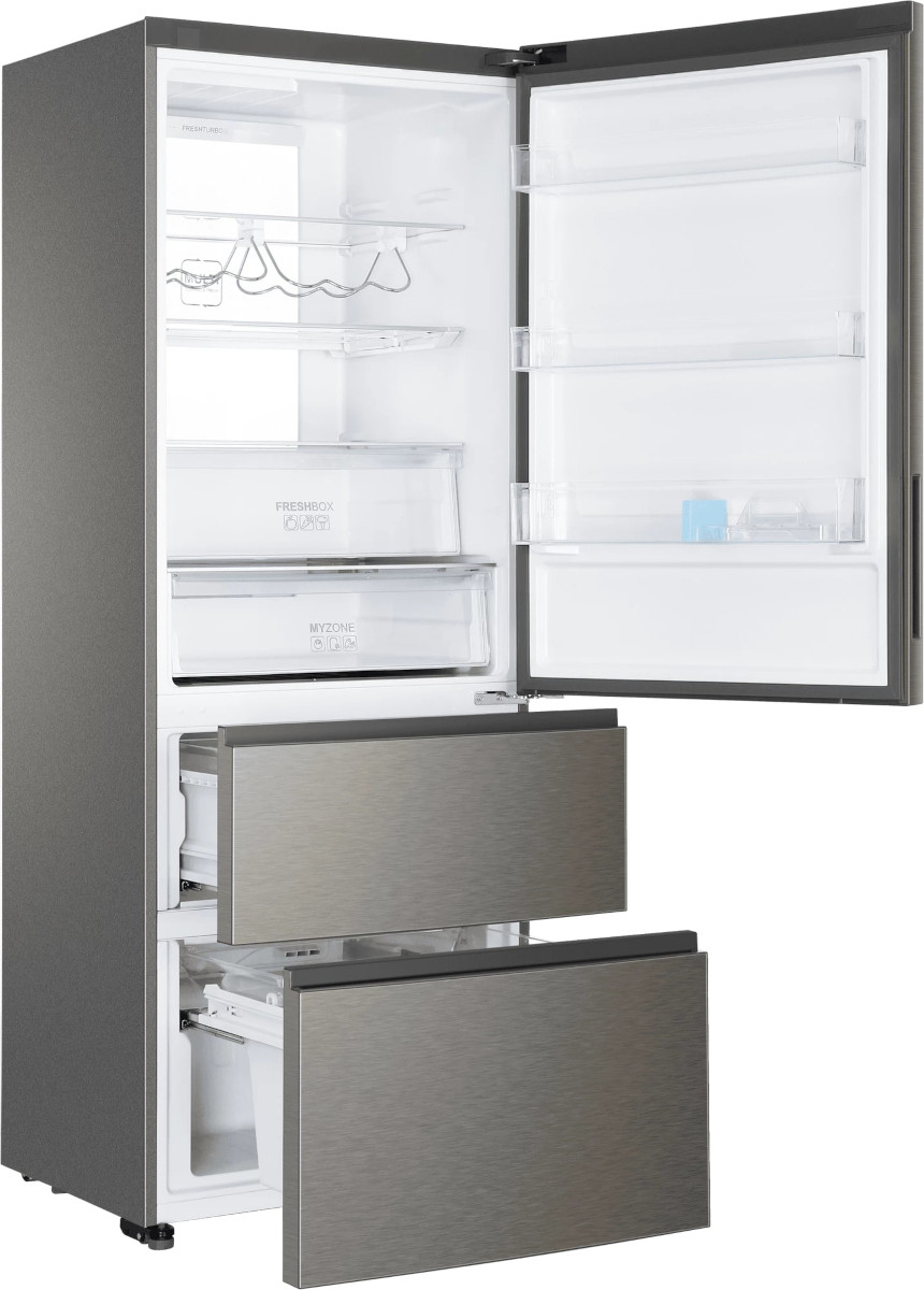 Трехкамерные модели выпускаются в нескольких вариантах. В некоторых случаях в качестве третьей камеры поступает так называемая зона свежести — отделение, где поддерживается температура около 0 градусов. В другом варианте подобные модели имеют морозильную камеру, состоящую из двух выдвижных ящиков.