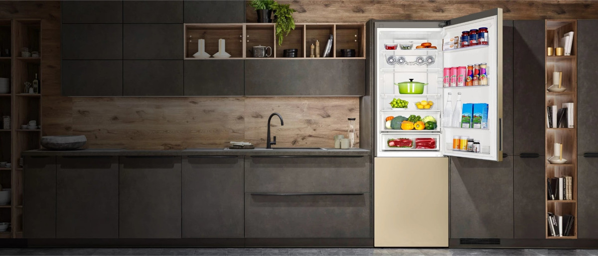 Если ваша кухня оборудована в классическом стиле, то в ней будет уместен в холодильник теплого бежевого цвета. Он хорошо подойдет к таким материалам, как натуральное дерево, текстиль, натуральный камень.