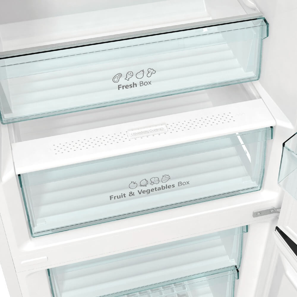Ящики для продуктов изготавливаются либо целиком из прозрачного пластика, либо часто имеют переднюю прозрачную панель, которая обеспечивает лучший обзор. Полки в большинстве холодильников могут перемещаться по высоте, устанавливаются на специальных направляющих и без труда снимаются для очистки.