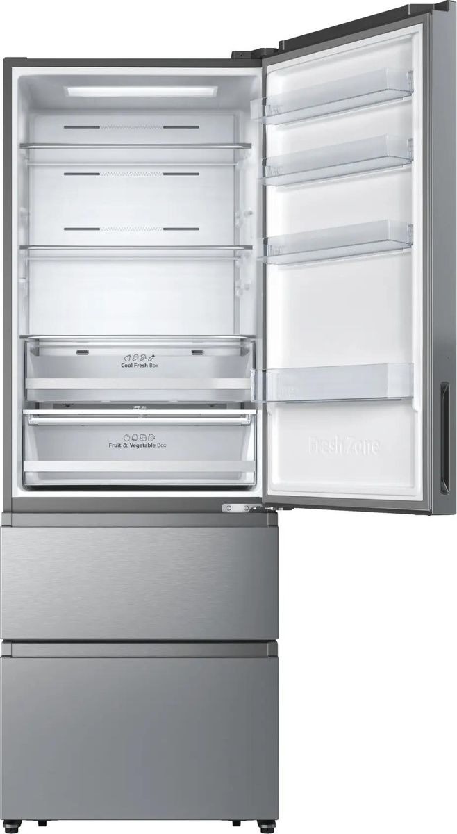 Трехкамерные модели выпускаются в нескольких вариантах. В некоторых случаях в качестве третьей камеры поступает так называемая зона свежести — отделение, где поддерживается температура около 0 градусов. В другом варианте подобные модели имеют морозильную камеру, состоящую из двух выдвижных ящиков.