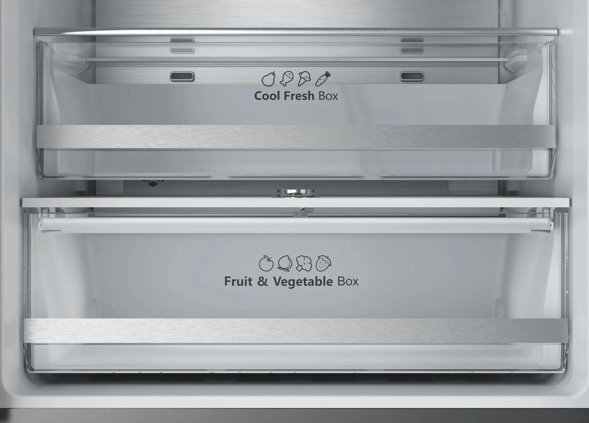 Вместительные контейнеры позволяют хранить достаточное количество овощей и фруктов. Для более длительного хранения и поддержания свежести овощей и фруктов разработаны специальные системы хранения. Среди них, например, зона свежести с увеличенной влажностью до 85% и температурой около 0 градусов. Это герметично закрывающийся ящик, часто на выдвижных роликах или направляющих, в котором имеется специальное задвижка, позволяющая регулировать влажность. Как известно, при более высокой влажности продукты с большим содержанием воды дольше остаются свежими.