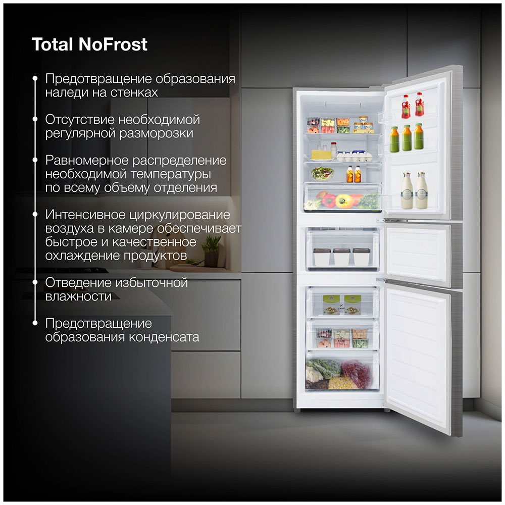 No Frost (Total No Frost, Frost Free): вентилятор обеспечивает циркуляцию охлажденного воздуха, благодаря чему лед не нарастает на стенке, а концентрируется только на скрытом внутри холодильника испарителе. Талая вода собирается в специальной емкости и испаряется. Такой холодильник не нужно размораживать – это экономит время и позволяет не останавливать прибор. Благодаря этим плюсам в современных моделях No Frost – самая распространенная система.