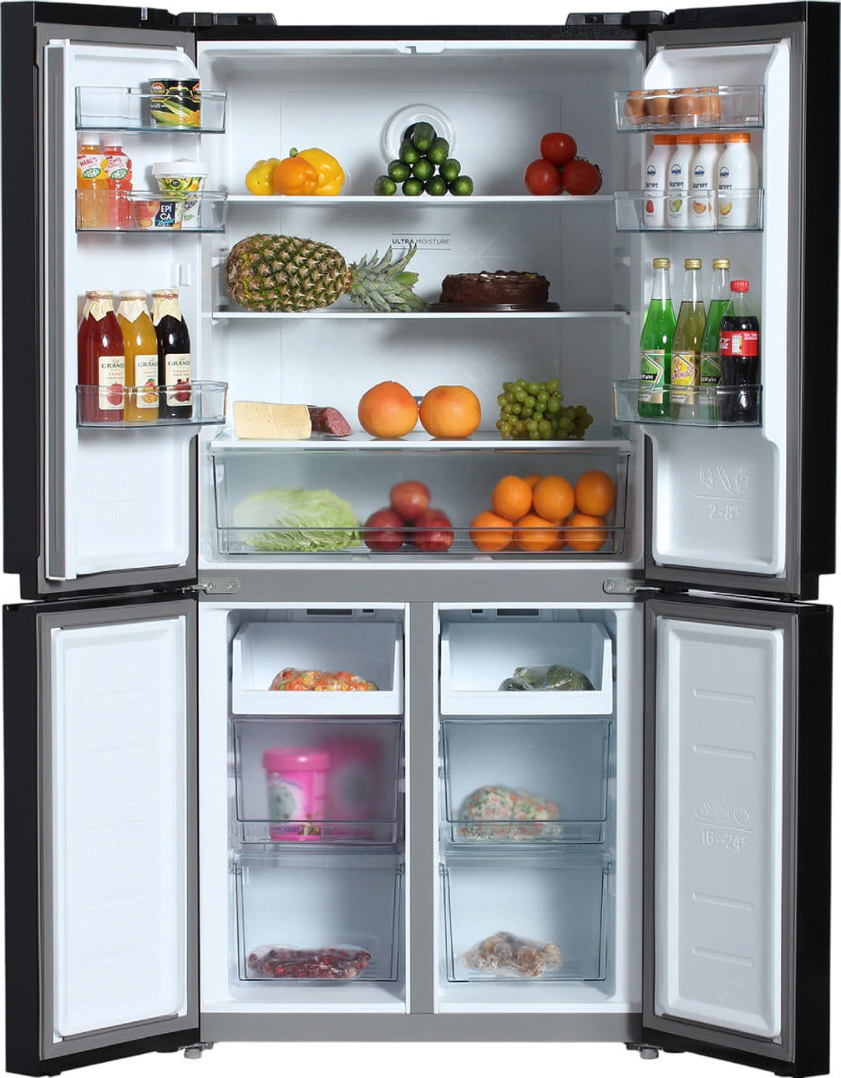 Четырех-, пяти- и шестикамерные модели включают, кроме морозильной и холодильной камер, отдельную зону свежести (иногда состоящую из сухого и влажного отсеков) и специальный отсек для ледогенератора, а в некоторых случаях еще и винное отделение.