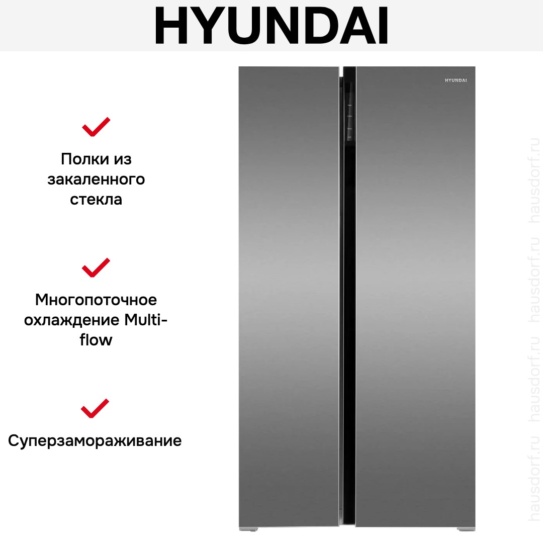 Холодильник Hyundai CS6503FV — отдельно стоящий агрегат вида side-by-side в корпусе из нержавеющей стали, который сочетает вместительность и строгий внешний вид.