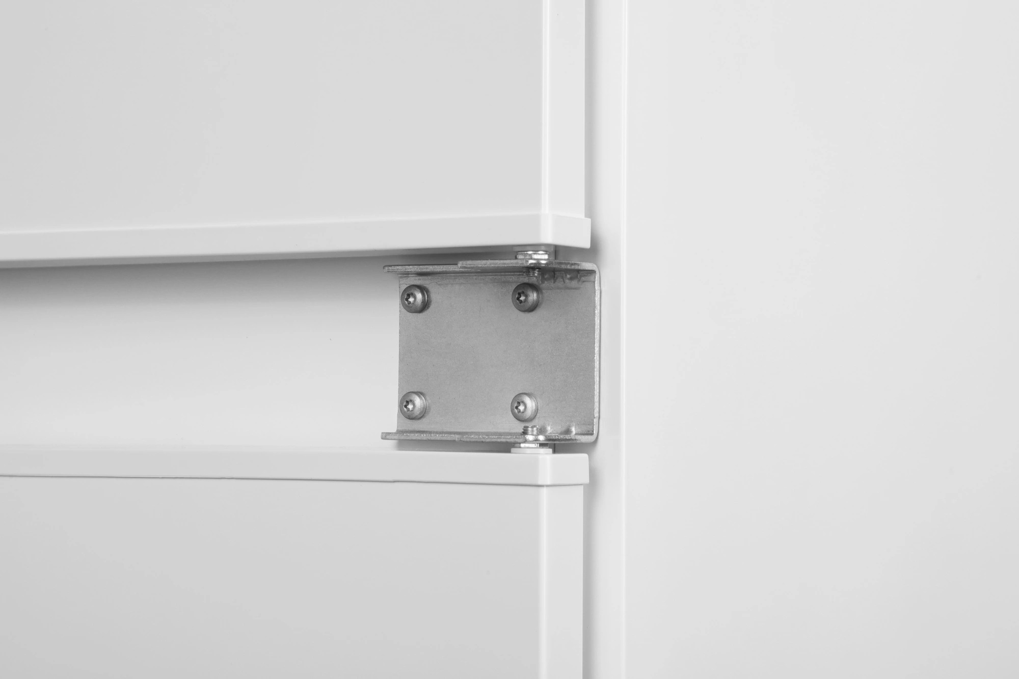 Полки в отделении бывают нескольких типов. Чаще всего встречаются полки из закаленного или ударопрочного стекла. Закаленное стекло выдерживает особенно большие нагрузки до 25 кг, так что на них можно устанавливать посуду из любого материала. Стекло является безопасным нейтральным материалом, не желтеет и не портится со временем, а также быстро и легко моется. Для того чтобы предотвратить проливание жидкости, полки оснащаются металлической или пластиковой окантовкой.