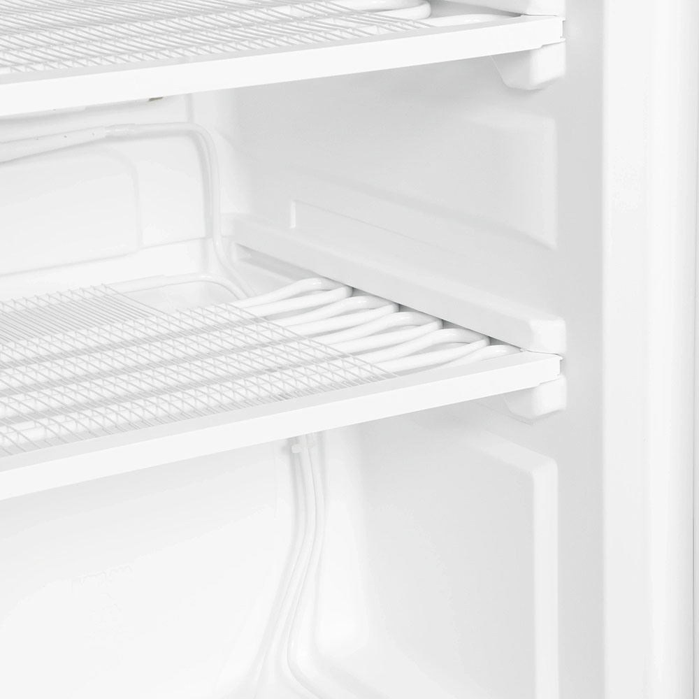 Полки в отделении бывают нескольких типов. Чаще всего встречаются полки из закаленного или ударопрочного стекла. Закаленное стекло выдерживает особенно большие нагрузки до 25 кг, так что на них можно устанавливать посуду из любого материала. Стекло является безопасным нейтральным материалом, не желтеет и не портится со временем, а также быстро и легко моется. Для того чтобы предотвратить проливание жидкости, полки оснащаются металлической или пластиковой окантовкой.