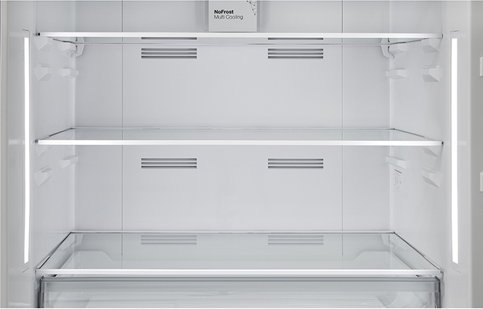 No Frost (Total No Frost, Frost Free): вентилятор обеспечивает циркуляцию охлажденного воздуха, благодаря чему лед не нарастает на стенке, а концентрируется только на скрытом внутри холодильника испарителе. Талая вода собирается в специальной емкости и испаряется. Такой холодильник не нужно размораживать – это экономит время и позволяет не останавливать прибор. Благодаря этим плюсам в современных моделях No Frost – самая распространенная система.