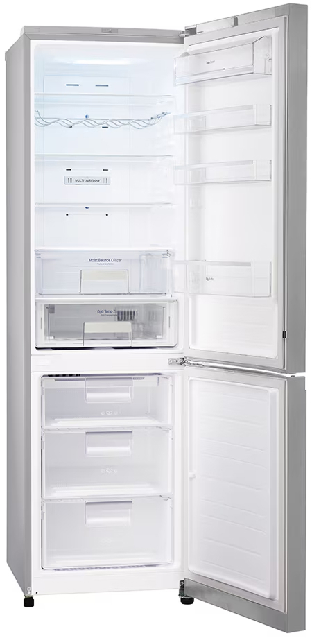 Специальная зона свежести предназначена для правильного и более длительного хранения овощей, фруктов, зелени. В ней поддерживается околонулевая температура, поэтому продукты не перемораживаются и не пересыхают. Система охлаждения этого холодильника — Multi-Airflow-System.