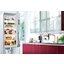 Встраиваемые холодильники монтируются в нишу или колонну. Передняя их часть закрывается декоративным мебельным фасадом и снаружи не отличается от дверцы обычного кухонного шкафа, так что их не нужно подбирать под интерьер помещения. Объем этих холодильников, как правило, несколько меньше, чем у отдельностоящих, так как при встраивании необходимо оставлять свободное пространство для вентиляции. Они отличаются меньшим уровнем шума, а также лучше держат холод и отличаются большей экономичностью из-за дополнительного слоя изоляции. Ассортимент этих холодильников не так велик, как у отдельно стоящих, установка более трудоемкая, а стоимость обычно несколько выше.