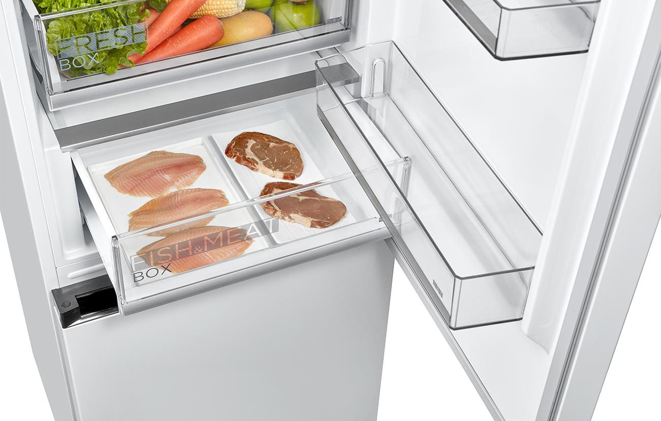 Вместительные контейнеры позволяют хранить достаточное количество овощей и фруктов. Для более длительного хранения и поддержания свежести овощей и фруктов разработаны специальные системы хранения. Среди них, например, зона свежести с увеличенной влажностью до 85% и температурой около 0 градусов. Это герметично закрывающийся ящик, часто на выдвижных роликах или направляющих, в котором имеется специальное задвижка, позволяющая регулировать влажность. Как известно, при более высокой влажности продукты с большим содержанием воды дольше остаются свежими.
