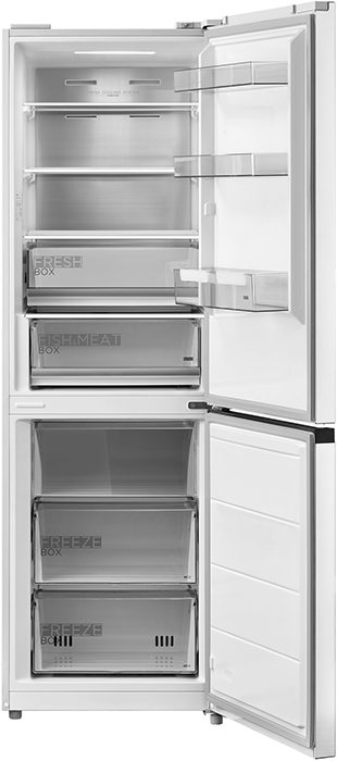 Дверной упор изначально расположен справа, но при необходимости его можно перенастроить на левую сторону, что обеспечивает гибкость при размещении в помещении. Внутреннее пространство продумано до деталей: регулируемые полки, вместительные ящики для овощей и фруктов, а также специальные отсеки для яиц, молочных изделий и бутылок позволяют адаптировать хранение под любые нужды.