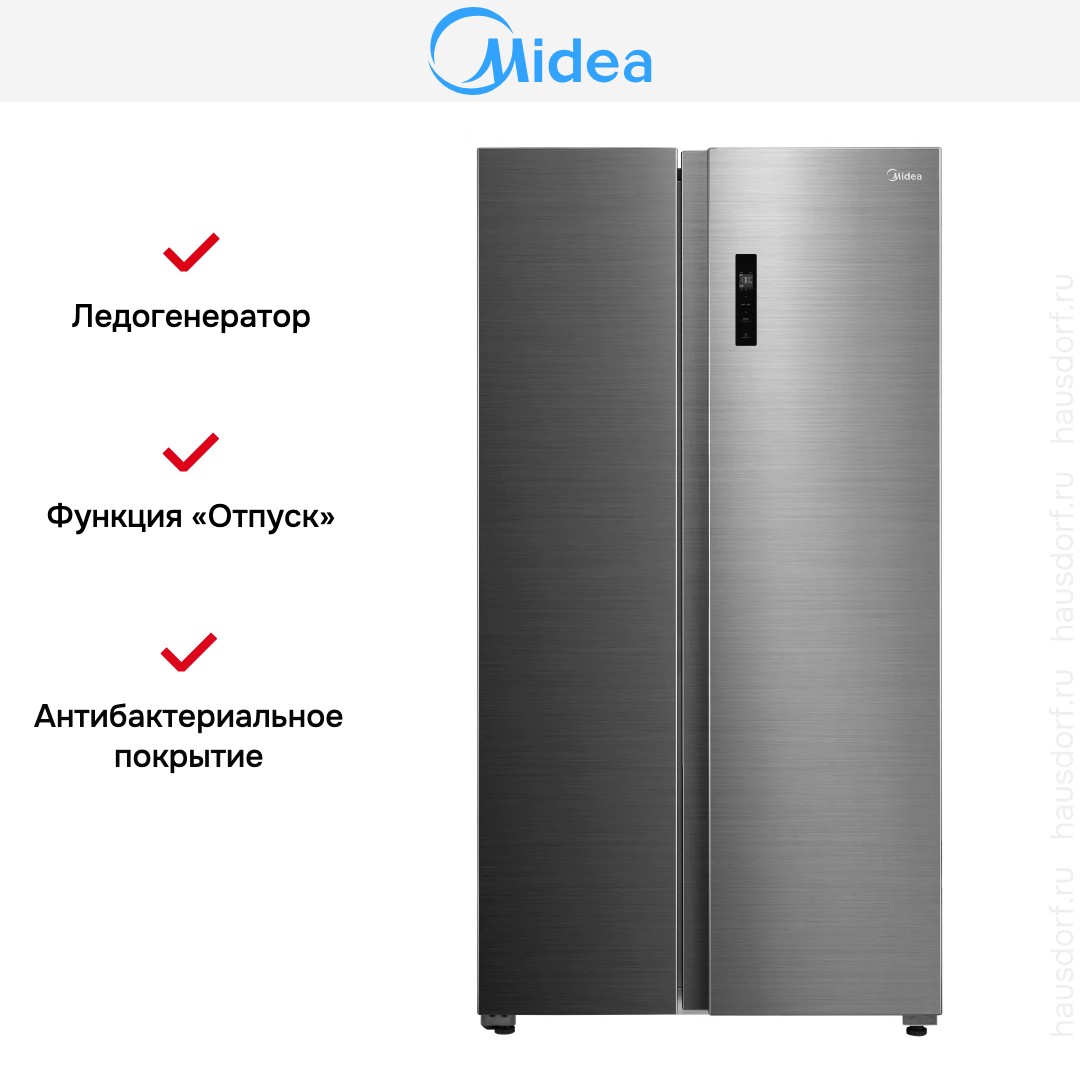 Холодильник Midea MDRS710FGE46 — отдельно стоящий Side-by-Side с элегантным фасадом из нержавеющей стали и габаритами 176.5×89.7×70.6 см. Такой внешний вид гармонично впишется в современную кухню и задаст стильный тон интерьеру. Двухдверная конструкция Side-by-Side обеспечивает симметрию и удобство доступа к крупным продуктам без лишних наклонов. Корпус с антибактериальным покрытием поддерживает чистоту внутренних поверхностей и снижает риск появления неприятных запахов.