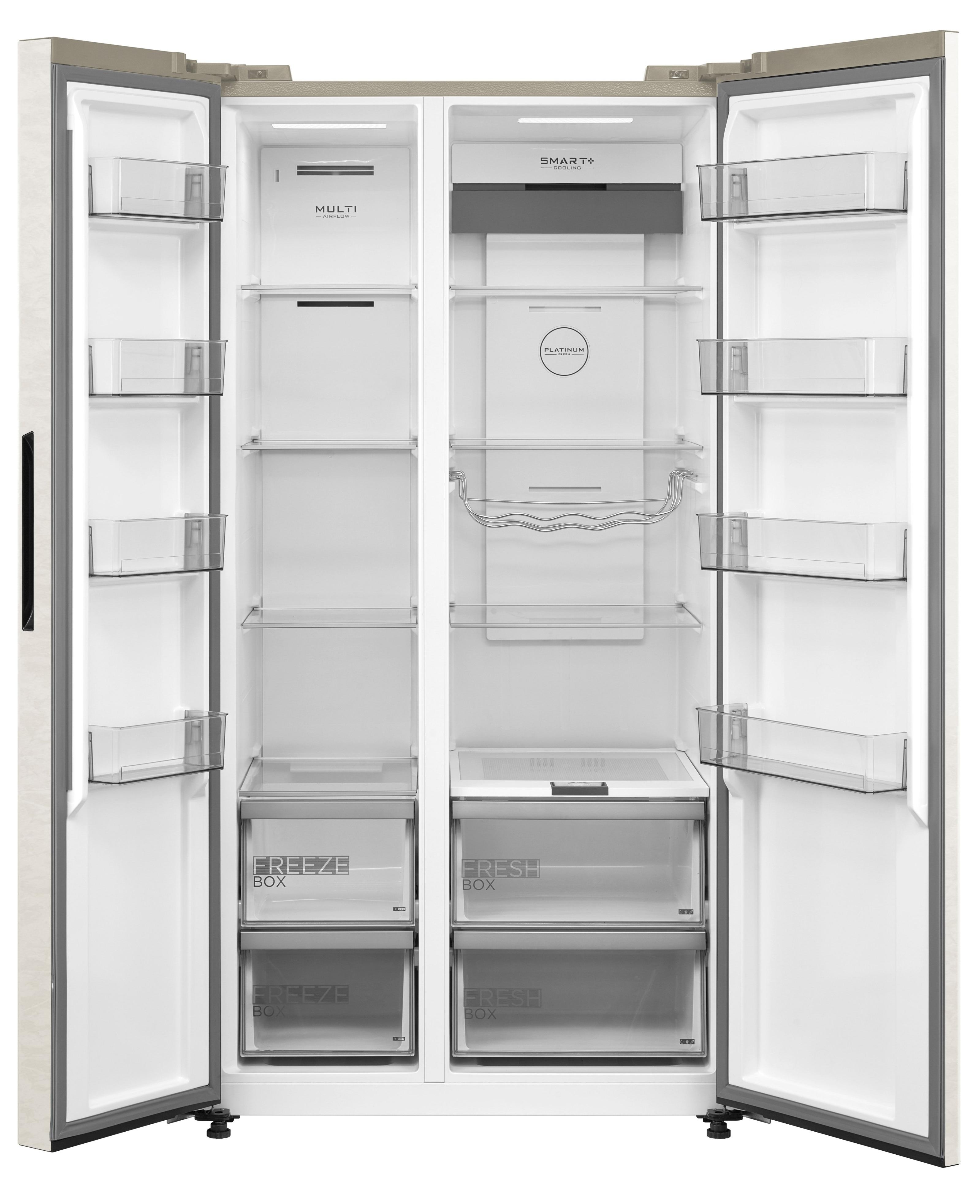 Данная модель — отдельностоящая, поэтому нужно тщательно подобрать место для ее размещения. Холодильник Side-by-Side с необычным расположением камер — сбоку друг от друга — позволяет увеличить объем продуктов для хранения. Такой вариант подходит обладателям просторной кухни, большим семьям, людям, которые запасают продукты и готовят впрок. Количество камер: 2.