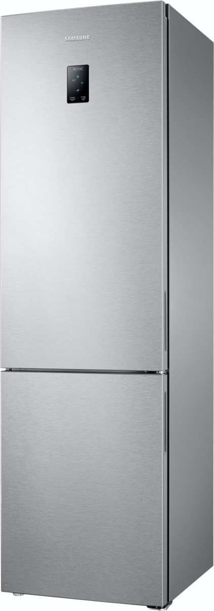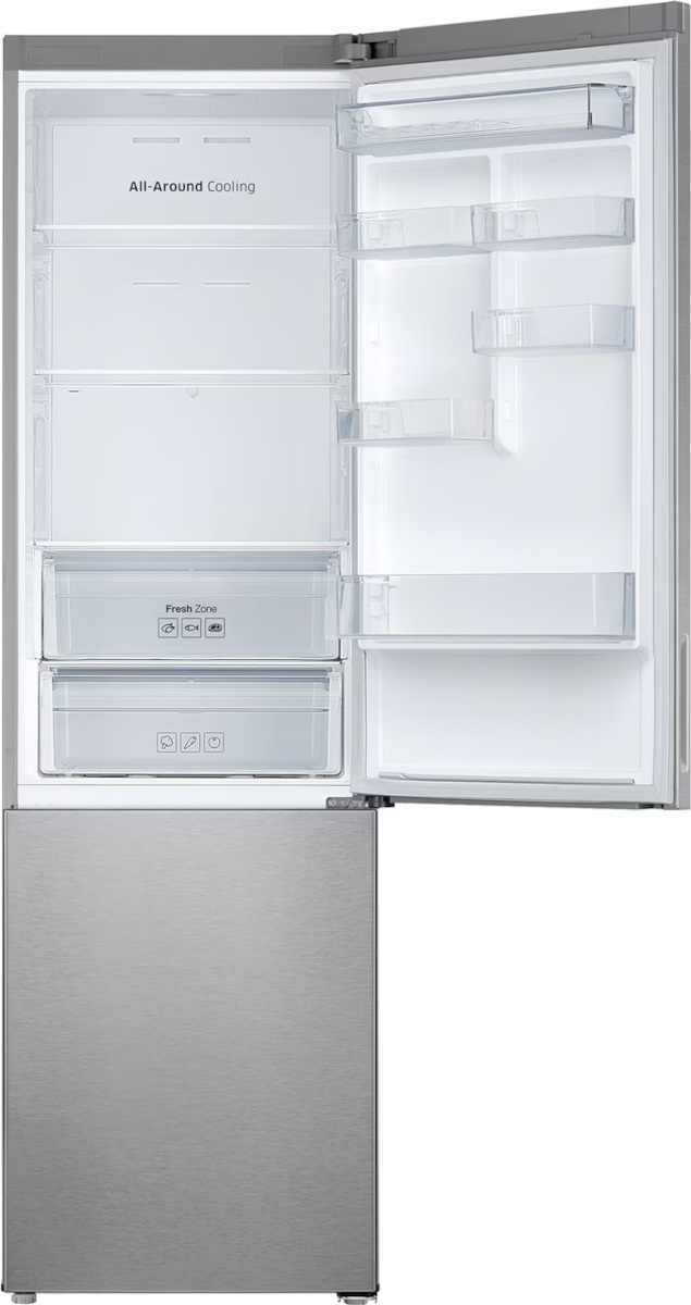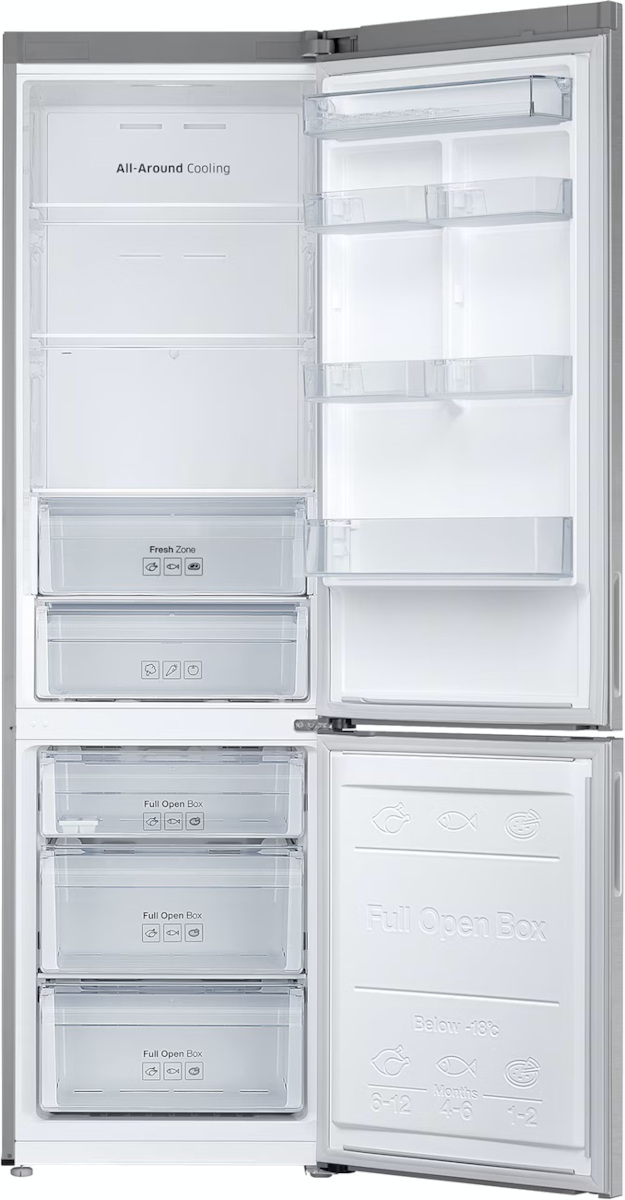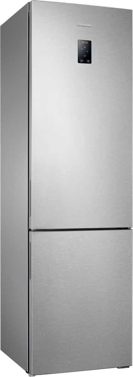 Samsung RB37A5200SA — отдельно стоящая модель с морозильным отделением внизу, выполненная в серебристом тоне с металлическим фасадом и скрытой ручкой. Высота 201 см, ширина 59.5 см и глубина 64.7 см позволяют расположить прибор у стены или в нише кухни. Правая петля двери и возможность перевешивания дают свободу планировки, а регулируемые ножки облегчают установку и выравнивание.