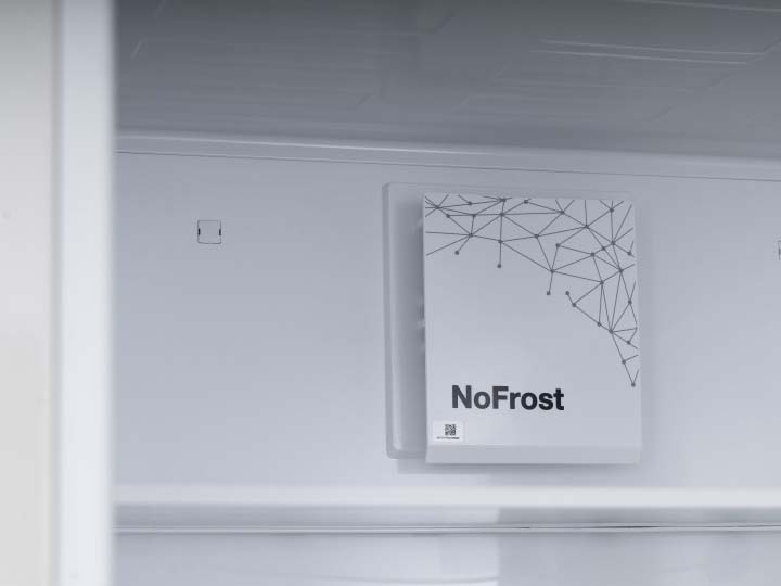 No Frost (Total No Frost, Frost Free): вентилятор обеспечивает циркуляцию охлажденного воздуха, благодаря чему лед не нарастает на стенке, а концентрируется только на скрытом внутри холодильника испарителе. Талая вода собирается в специальной емкости и испаряется. Такой холодильник не нужно размораживать – это экономит время и позволяет не останавливать прибор. Благодаря этим плюсам в современных моделях No Frost – самая распространенная система.