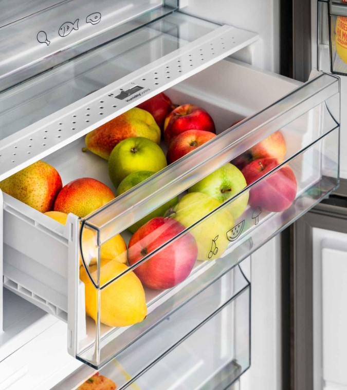 Ящики для продуктов изготавливаются либо целиком из прозрачного пластика, либо часто имеют переднюю прозрачную панель, которая обеспечивает лучший обзор. Полки в большинстве холодильников могут перемещаться по высоте, устанавливаются на специальных направляющих и без труда снимаются для очистки.