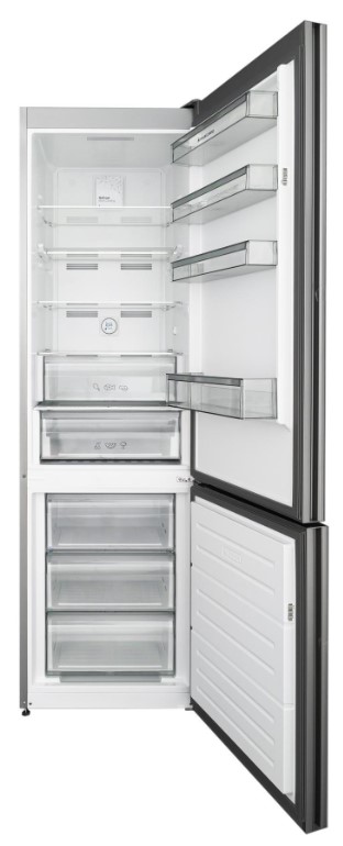 Корпус отдельно стоящий, глубокого чёрного оттенка, высота 201 см, ширина 59,5 см и глубина 65 см — пропорции удобны для стандартных ниш и позволяют экономно использовать пространство. Двухдверная компоновка с морозильной камерой внизу и правым дверным упором упрощает доступ к продуктам: чаще используемая холодильная секция располагается на уровне глаз, а нижняя камера скрывает замороженные запасы. На дверце расположен цифровой дисплей с сенсорными кнопками, благодаря чему настройки видны всегда и легко корректируются одним касанием.
