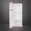 Холодильник с морозильной камерой в стиле 50-х годов розового цвета. Дверь нельзя перевесить на другую сторону, петли расположены слева. Есть специальные полки для бутылок, ящики для овощей и отдельная зона свежести. Размораживание автоматическое и ручное.
