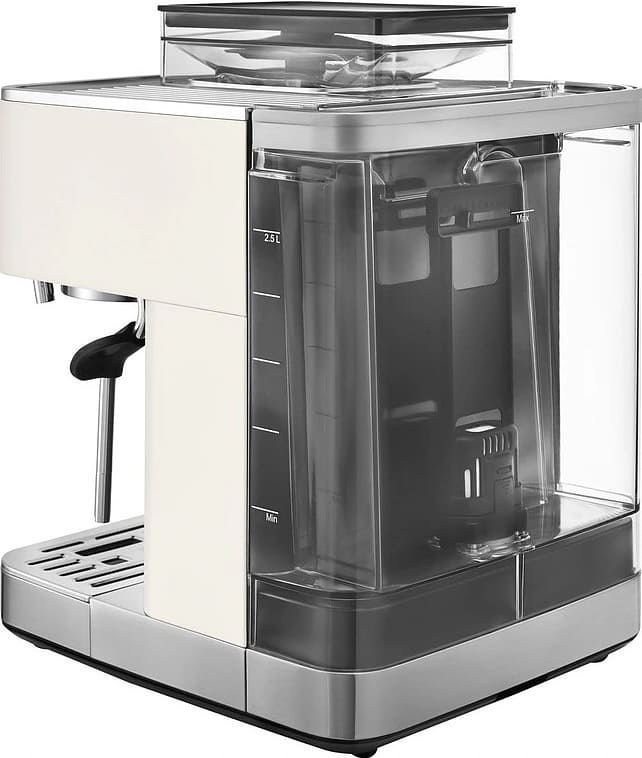 Визуальные характеристики кофемашины играют важную роль при выборе. Цвет корпуса этой модели — белый. Основной материал поверхности — пластик.