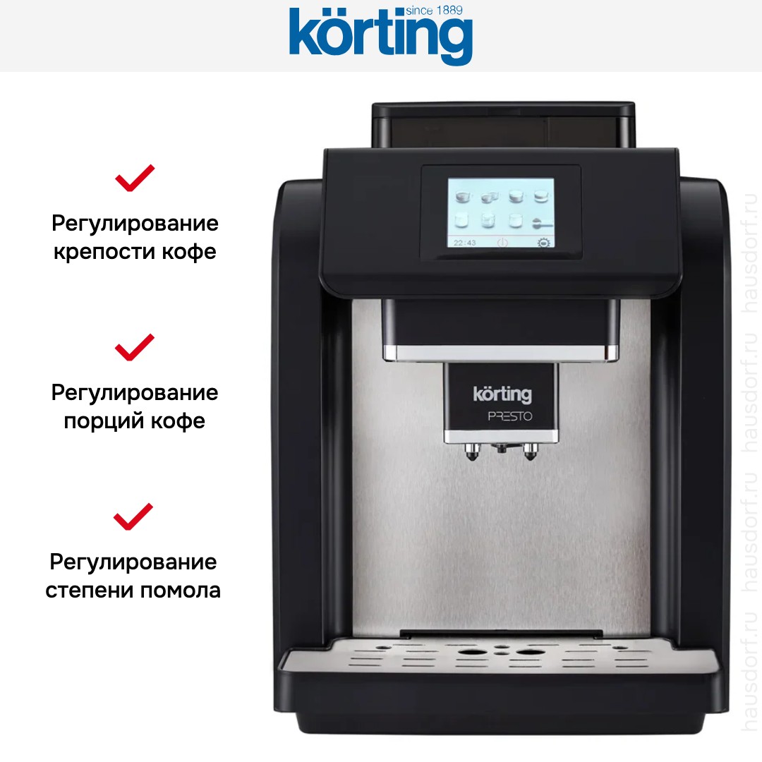В модели Korting KACM 2009 Presto используются сразу два типа кофе — молотый и зерновой: это расширяет ваши возможности и увеличивает разнообразие напитков, которые можно приготовить с отличиями в крепости, ароматности и терпкости. Автоматическая кофемашина — по сути облегченная и уменьшенная версия приборов из кафе, она обладает широкими возможностями, разнообразным меню и продуманной системой контроля за процессом. Это отличный выбор как для дома, так и для офиса.