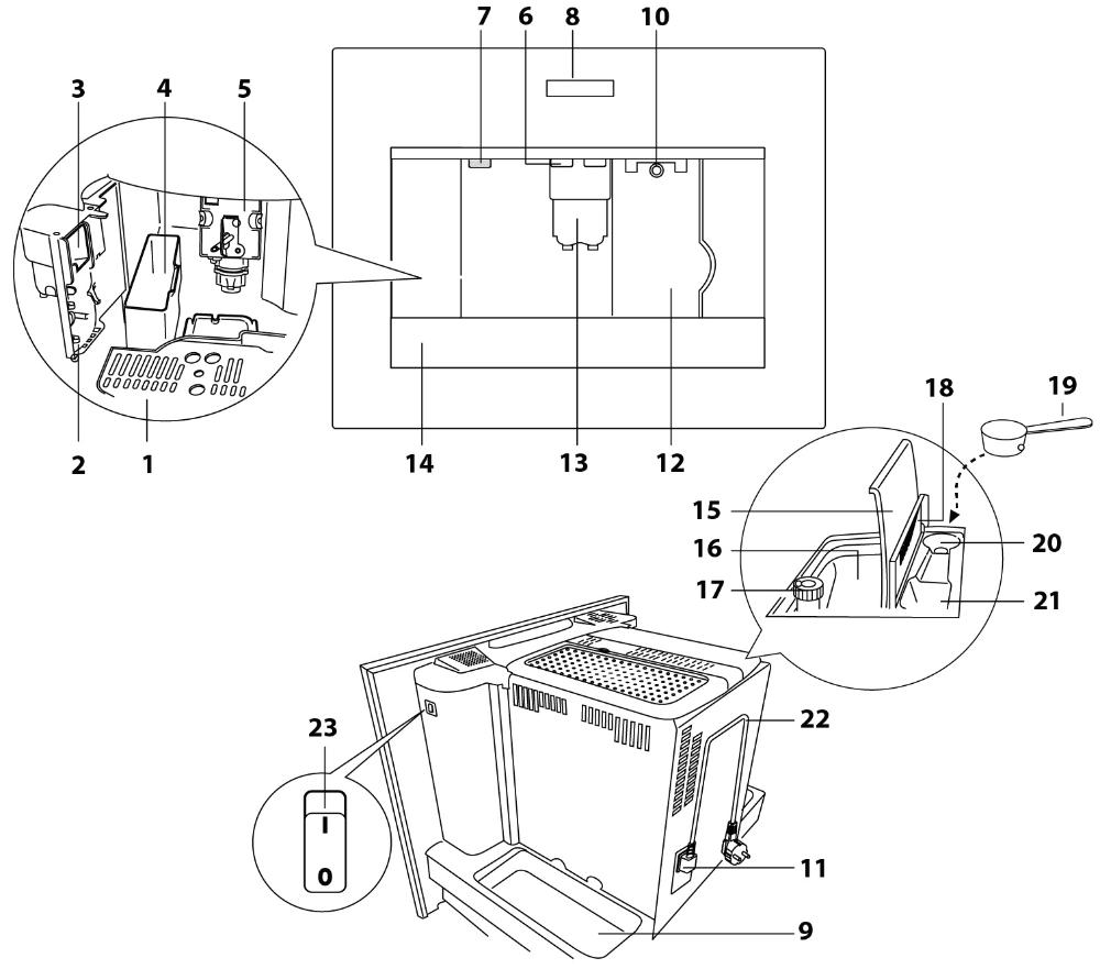 Контейнер для кофейных зерен — принадлежность кофемашин, оборудованных кофейной мельницей. Как правило, над мельницей он и располагается для более удобного помола кофе. Подобные контейнеры изготавливаются из безопасного пластика, прозрачного или непрозрачного, и бывают съемными и несъемными. Они оснащаются специальными датчиками, которые анализируют количество кофе, для оповещения о том, что контейнер скоро опустеет. Доступ к контейнеру для зерен зависит от типа встраивания кофемашины. Так, во встроенных машинах требуется вдвинуть прибор на телескопических направляющих.