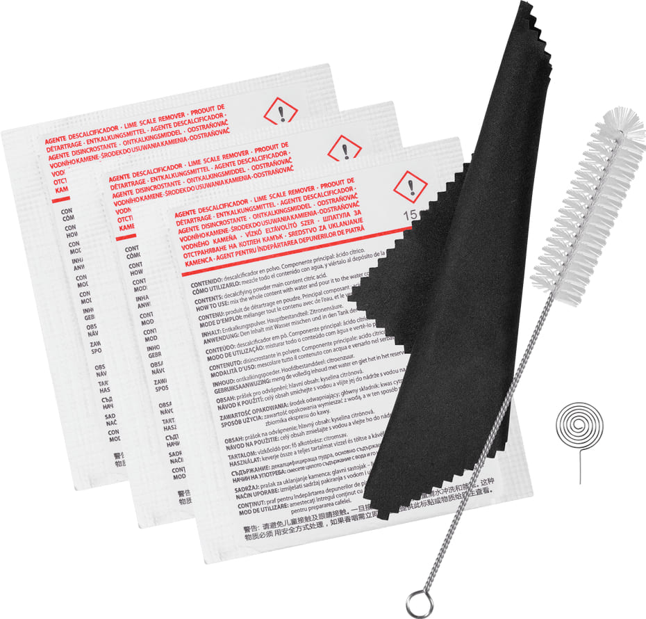 Чтобы удалить накипь, используется специальное химическое средство. Иногда оно входит в комплект, в других случаях приобретается дополнительно. Растворенное в воде чистящее средство заливается в резервуар для воды, после чего запускается программа декальцинации нажатием соответствующих кнопок либо выбором команды меню. Очистка происходит автоматически, вода с растворенным в ней средством и химическими веществами удаляется через раздаточное отверстие. После этого также автоматически начинается промывка системы и удаление остатков чистящего средства. Вода также сливается через кран. О ходе очистки и промывки оповещают индикаторы или сообщения на экране.