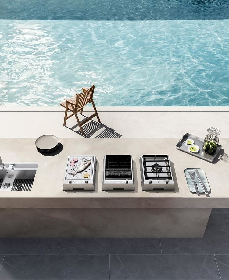 Отдельный гриль — отличное решение для дачной кухни. Он может быть встраиваемым или переносным, электрическим или газовым, открытым или прижимным. Принцип работы во всех случаях один — продукты быстро обжариваются под воздействием высоких температур (в районе 270 градусов). Благодаря этому можно получить любимые блюда без открытого огня.
