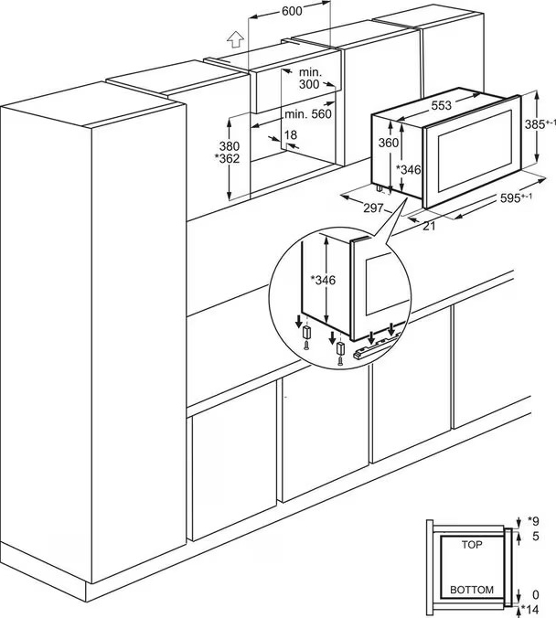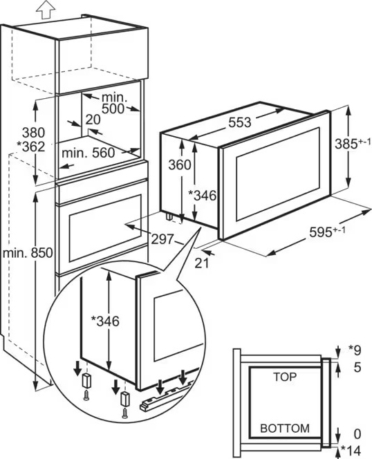 Глубина микроволновой печи —параметр, наиболее сильно влияющий на объем камеры и на диаметр вращающегося стеклянного блюда. Отдельно стоящие микроволновки соло, а также приборы, оснащенные грилем, имеют глубину от 35 до 45 см. При их установке на столешнице следует учитывать, в какую сторону и насколько широко будет открываться дверца. Глубина микроволновки, которая встраивается в кухонную мебель, также варьируется в широком диапазоне. Для полноразмерных моделей с откидной или навесной дверцей она может составить около 52-55 см, а для менее вместительных приборов — порядка 32-35 см.