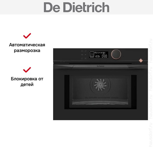 Количество режимов в данной модели Де Дитрих: 5 шт. Для обработки продуктов и готовых блюд используются следующие виды нагрева: Микроволны. Автоматические программы для приготовления добавлены производителем также для упрощения работы.