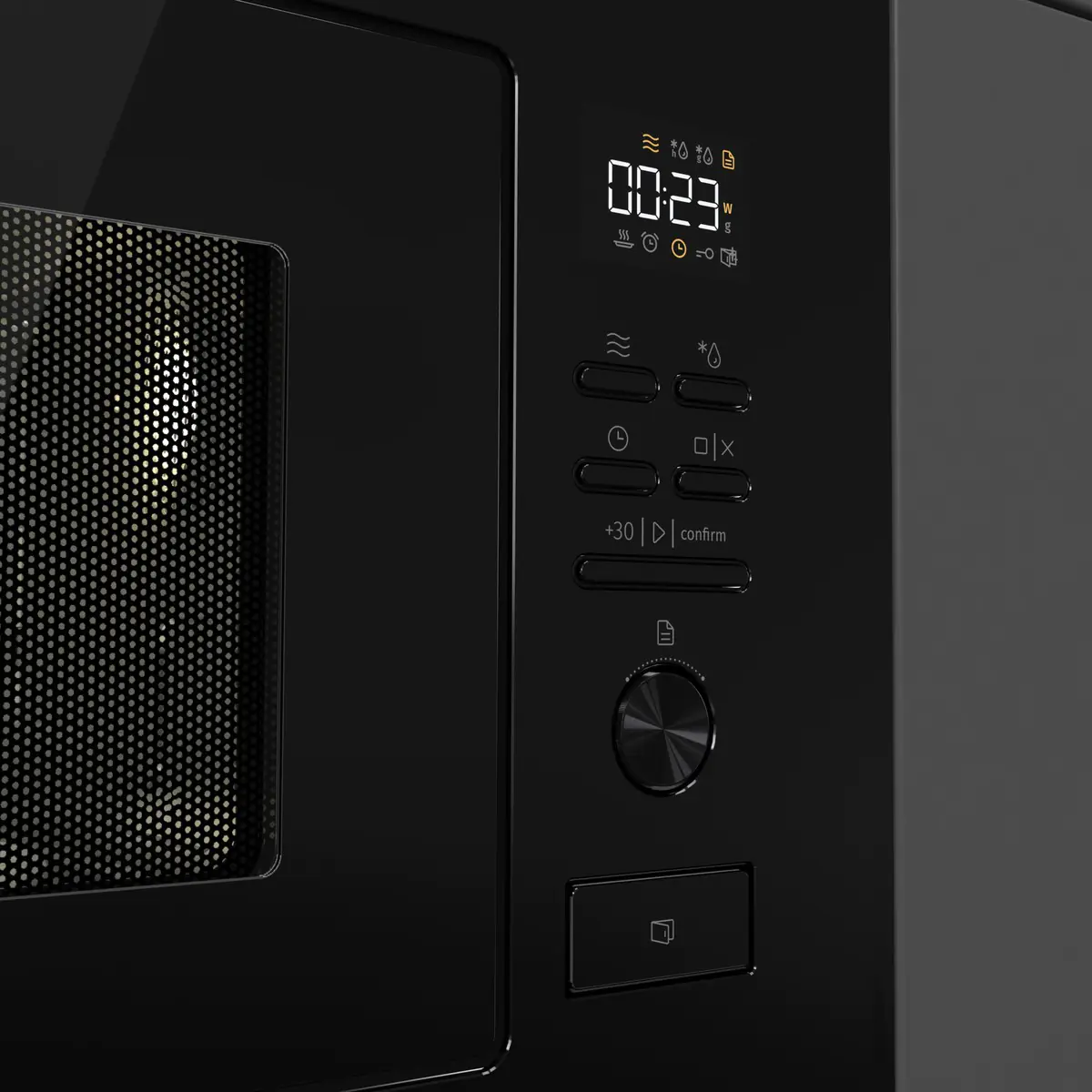 Материал внутренней поверхности — нержавеющая сталь. Благодаря ей хорошо аккумулируется и поддерживается тепло, прибор долго служит без повреждений. Полезный объем для готовки — 20 л. Для установки и прогрева посуды используется классическое вращающееся блюдо. Понятное электронное управление не вызовет трудностей ни у кого из вашей семьи. Для изменения настроек или выбора программ используются следующие переключатели: кнопочные + поворотные утапливаемые.