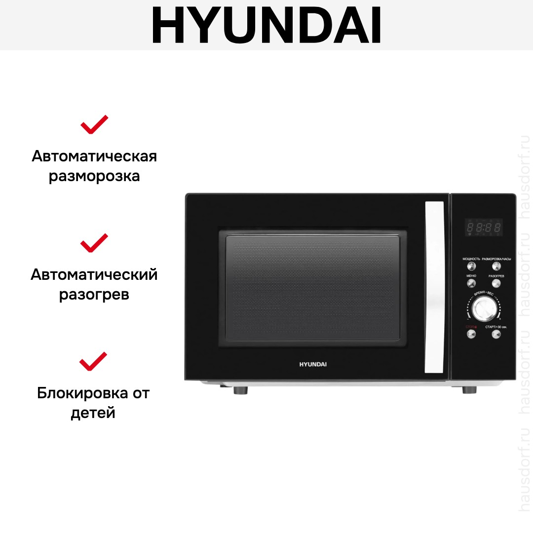 Количество режимов в данной модели Хендай: 3 шт. Для обработки продуктов и готовых блюд используются следующие виды нагрева: Микроволны, Автоматический режим разморозки, Автоматический режим приготовления. Если вы спешите, а еду нужно разогреть, используйте быстрый старт — благодаря ему 30 секунд прибор работает на полной мощности. Отдельная опция для размораживания продуктов и полуфабрикатов облегчает жизнь — не нужно самостоятельно настраивать параметры. Автоматические программы для приготовления добавлены производителем также для упрощения работы.