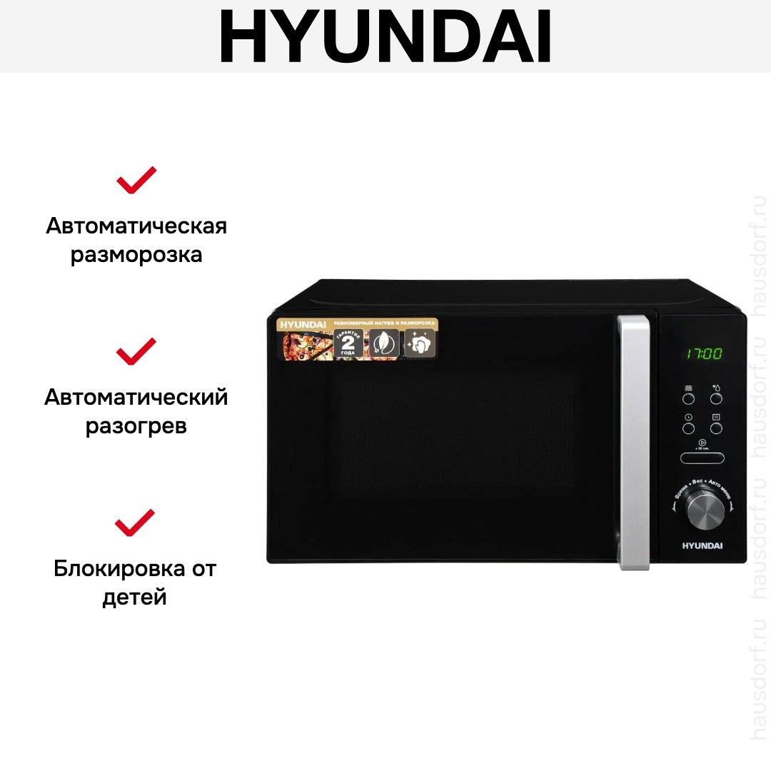 Количество режимов в данной модели Хендай: 3 шт. Для обработки продуктов и готовых блюд используются следующие виды нагрева: Микроволны, Автоматический режим разморозки, Автоматический режим приготовления. Если вы спешите, а еду нужно разогреть, используйте быстрый старт — благодаря ему 30 секунд прибор работает на полной мощности. Отдельная опция для размораживания продуктов и полуфабрикатов облегчает жизнь — не нужно самостоятельно настраивать параметры. Автоматические программы для приготовления добавлены производителем также для упрощения работы.
