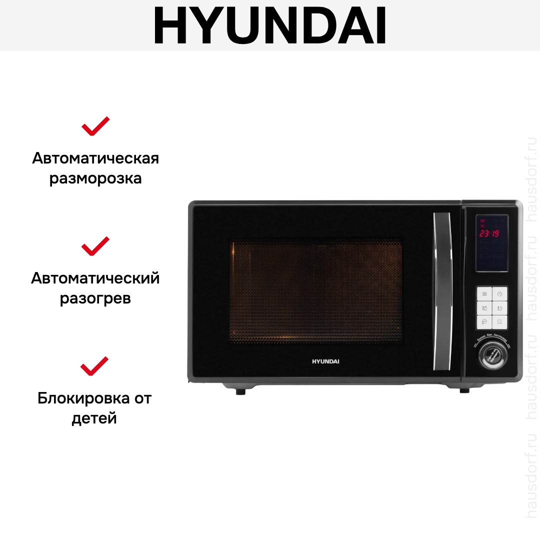Количество режимов в данной модели Хендай: 3 шт. Для обработки продуктов и готовых блюд используются следующие виды нагрева: Микроволны, Автоматический режим разморозки, Автоматический режим приготовления. Если вы спешите, а еду нужно разогреть, используйте быстрый старт — благодаря ему 30 секунд прибор работает на полной мощности. Отдельная опция для размораживания продуктов и полуфабрикатов облегчает жизнь — не нужно самостоятельно настраивать параметры. Автоматические программы для приготовления добавлены производителем также для упрощения работы.