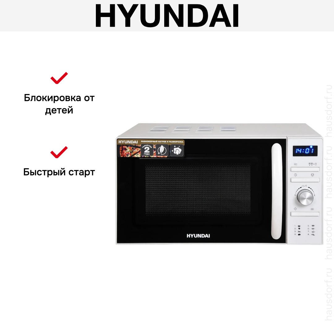 Количество режимов в данной модели Хендай: 3 шт. Для обработки продуктов и готовых блюд используются следующие виды нагрева: Микроволны, Автоматический режим разморозки, Автоматический режим приготовления. Если вы спешите, а еду нужно разогреть, используйте быстрый старт — благодаря ему 30 секунд прибор работает на полной мощности. Отдельная опция для размораживания продуктов и полуфабрикатов облегчает жизнь — не нужно самостоятельно настраивать параметры. Автоматические программы для приготовления добавлены производителем также для упрощения работы.