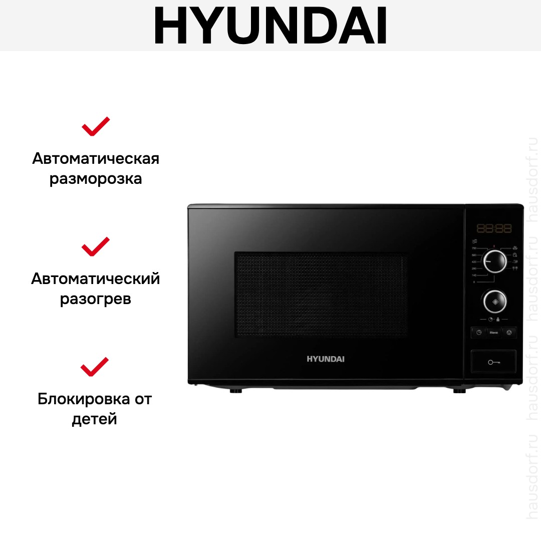 Количество режимов в данной модели Хендай: 3 шт. Для обработки продуктов и готовых блюд используются следующие виды нагрева: Микроволны, Автоматический режим разморозки, Автоматический режим приготовления. Если вы спешите, а еду нужно разогреть, используйте быстрый старт — благодаря ему 30 секунд прибор работает на полной мощности. Отдельная опция для размораживания продуктов и полуфабрикатов облегчает жизнь — не нужно самостоятельно настраивать параметры. Автоматические программы для приготовления добавлены производителем также для упрощения работы.