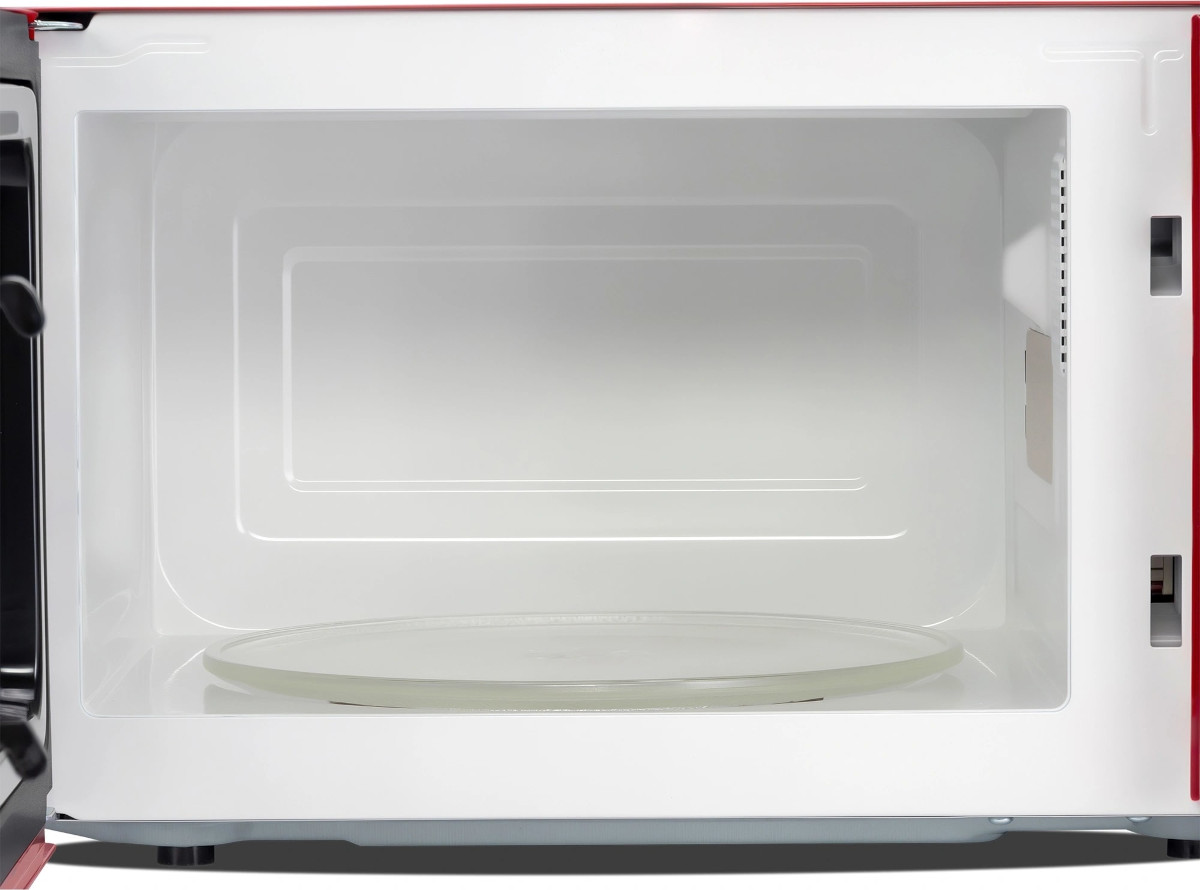 Материал внутренней поверхности — эмаль. Это самое распространенное покрытие, так как оно зарекомендовало себя высоким качеством, устойчивостью к механическим воздействиям и простотой ухода. Полезный объем для готовки — 20 л. Для установки и прогрева посуды используется классическое вращающееся блюдо. Понятное электронное управление не вызовет трудностей ни у кого из вашей семьи. Для изменения настроек или выбора программ используются следующие переключатели: кнопочные + поворотные.