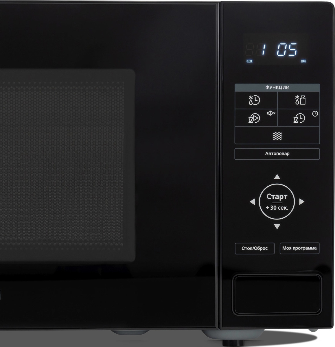 Материал внутренней поверхности — эмаль. Это самое распространенное покрытие, так как оно зарекомендовало себя высоким качеством, устойчивостью к механическим воздействиям и простотой ухода. Полезный объем для готовки — 23 л. Для установки и прогрева посуды используется классическое вращающееся блюдо. Понятное электронное управление не вызовет трудностей ни у кого из вашей семьи. Для изменения настроек или выбора программ используются следующие переключатели: сенсорные.