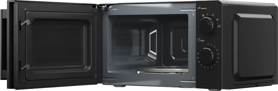 Микроволновые печи могут иметь навесную или откидную дверцу. Модели с навесной дверцей, запирающейся на механические защелки, могут быть как встраиваемыми, так и отдельно стоящими. Такие СВЧ-печи с дверцей, открывающейся влево или вправо, могут относиться к любой категории цен: от самых простых и дешевых до премиальных моделей. Недостатки дверцы с петлями сбоку — выступающая ручка, которая затрудняет очистку фасада, и небольшой угол открытия не более 90 градусов, который может препятствовать, например, размещению прибора в углу. Если ручка действительно мешает, стоит выбрать модель, дверца которой открывается нажатием на кнопку или прикосновением к сенсору на боковой панели управления.