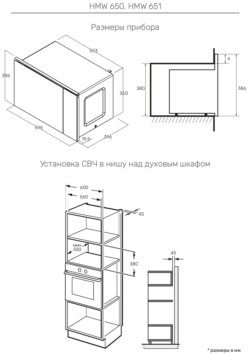 Высота микроволновой печи, то есть расстояние от основания до крышки прибора, определяется прежде всего типом встраивания. Отдельно стоящие модели — как соло, так и оснащенные грилем или конвекцией, — с камерой объемом от 15 до 30 литров, имеют высоту около 30 см. Такие микроволновки удобно размещаются на столе; при необходимости их можно убрать на полку или в шкаф. Встраиваемые в стандартную кухонную колонну или тумбу многофункциональные микроволновые печи имеют ту же высоту, что и другая встроенная техника: для компактных приборов она составляет 45 см, а для полноразмерных — порядка 60 см.