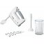 Обратите внимание на цвет миксера Бош — белый — он может стать как гармоничным дополнением кухонной обстановки, так и ярким акцентом. В комплекте с самим прибором идут дополнительные элементы: венчик для взбивания, крюки для теста, мерный стакан с крышкой, насадка-блендер.